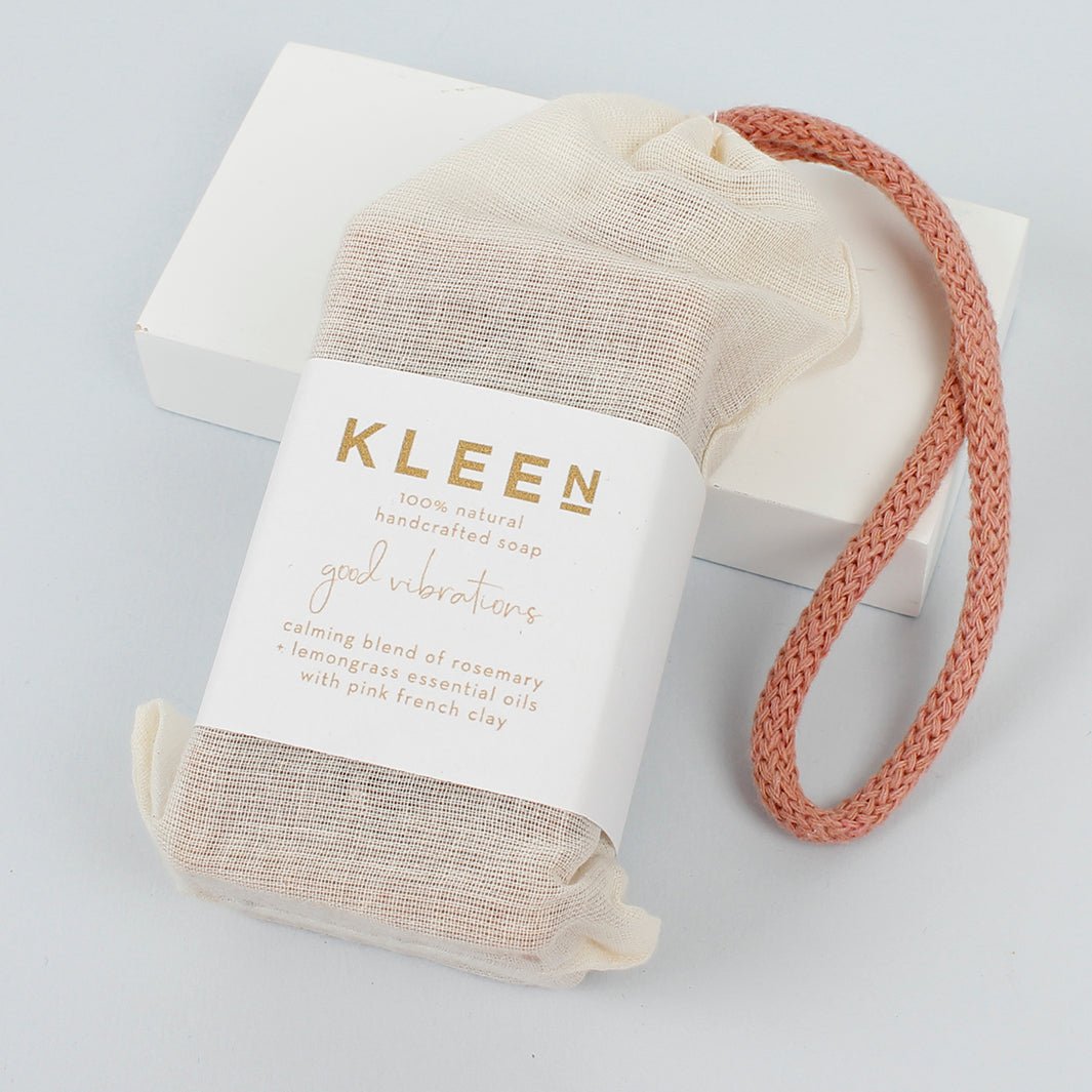 Get your daily shower to brighten the vibe with this mood-boosting chunky, new-generation soap on a rope by KleeN. Its calming blend of rosemary and lemongrass essential oils uplifts the senses, and pink French clay purifies and cleanses the skin. 160g.